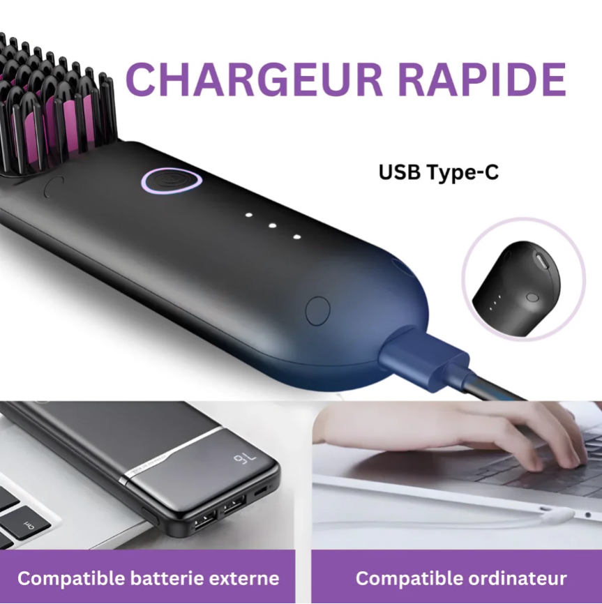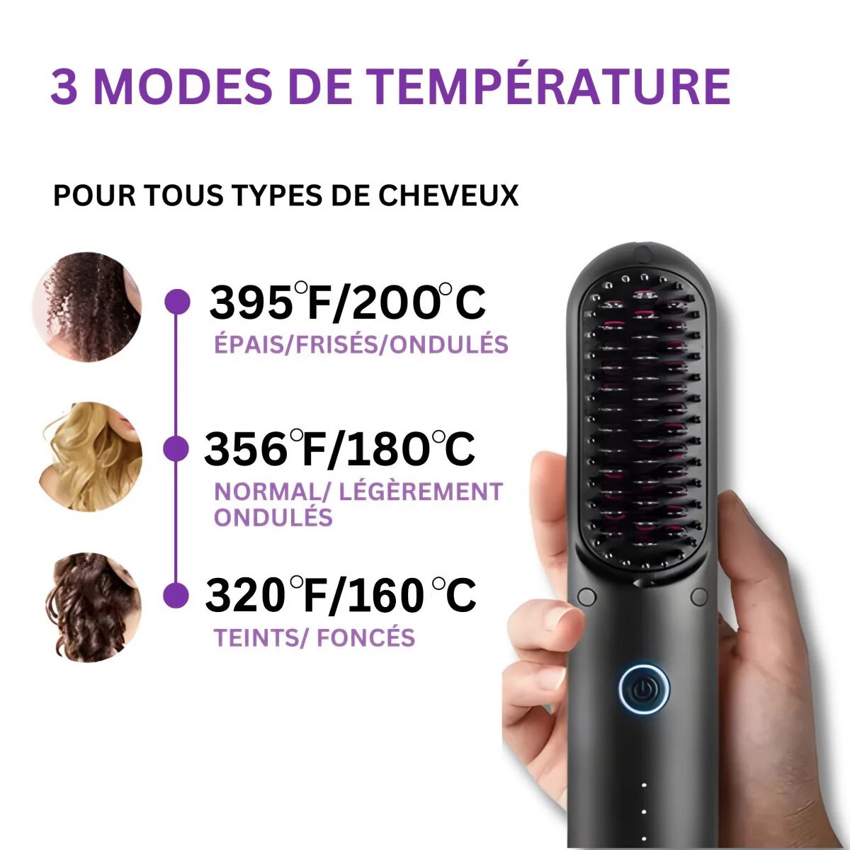Brosse lissante sans fil adaptée à tous types de cheveux. 3 modes de température pour un lissage rapide, soyeux et efficace, où que vous soyez.