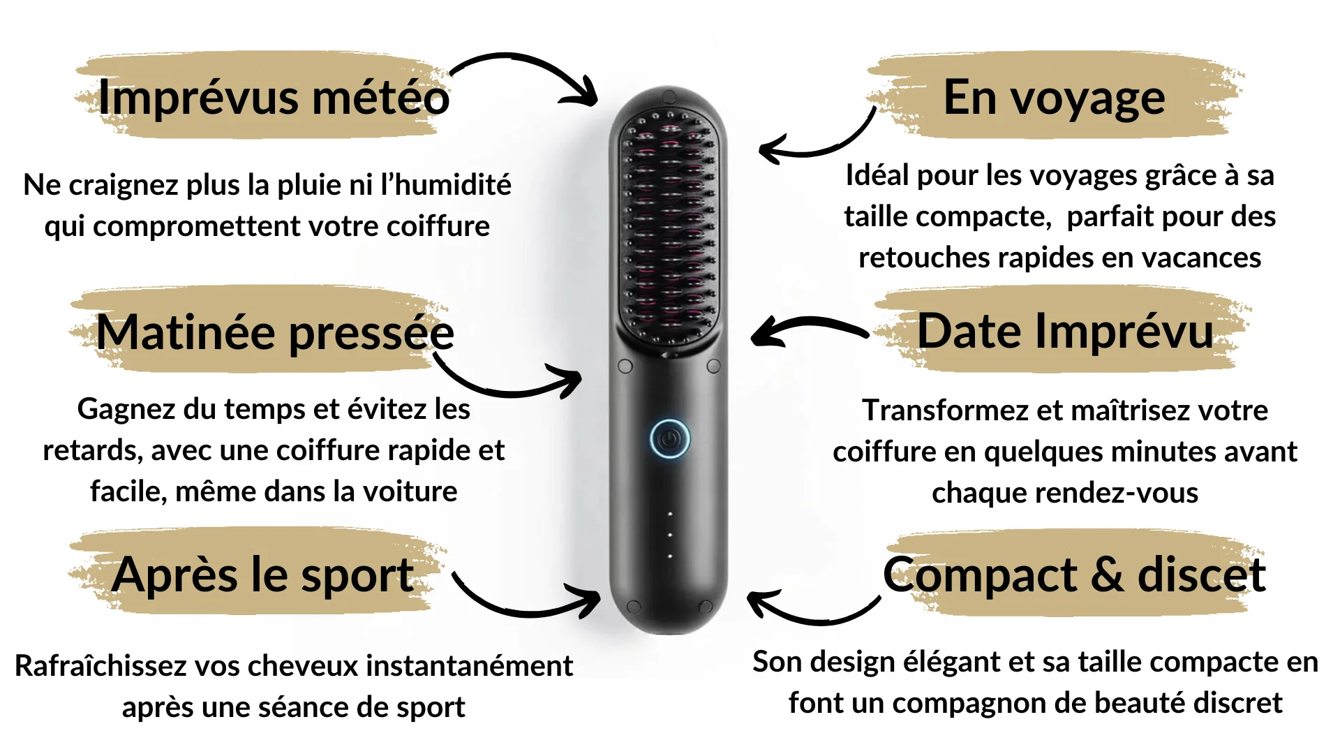 Compacte et portable, la brosse lissante sans fil vous accompagne partout pour un lissage rapide et impeccable à tout moment de la journée.